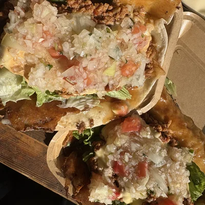 香ばしく焼いたトルティーヤに牛・豚合い挽き肉を数種類のスパイスで炒めたタコミート、チーズ、自家製フレッシュサルサをトッピング!食べ応えのある“タコス”をメイン料理として、手軽につまめるフライドポテト・ナチョスチップなど軽食、また各種ドリンク、アルコールもご用意してお待ちしております。